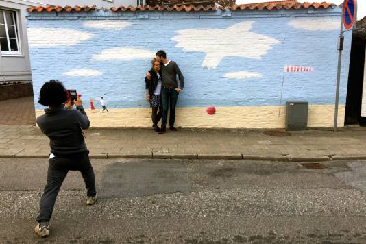 Bonggi Park taking photo of Jan and Saila in front of their mural, Art Jam in Højer 2018