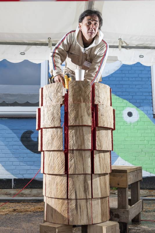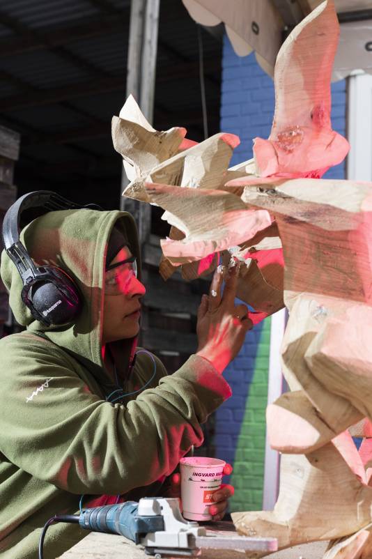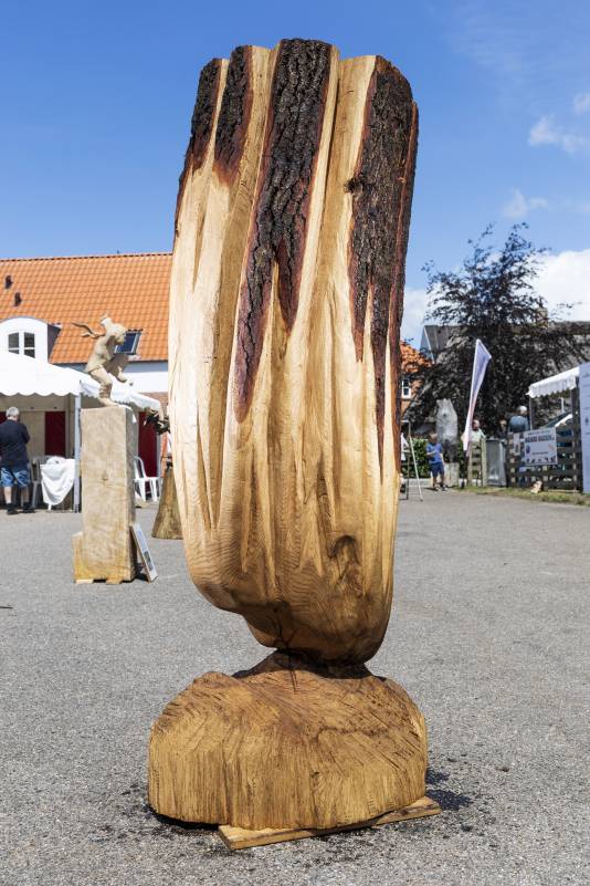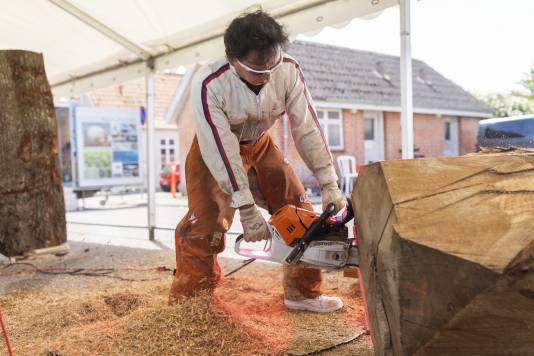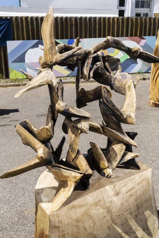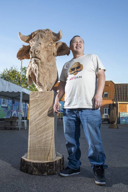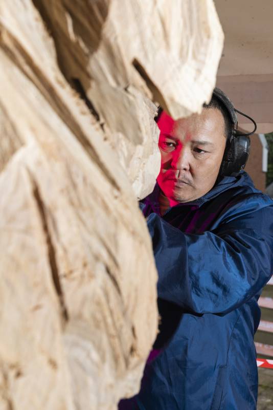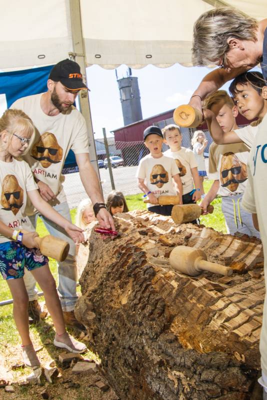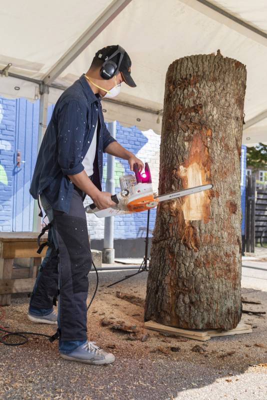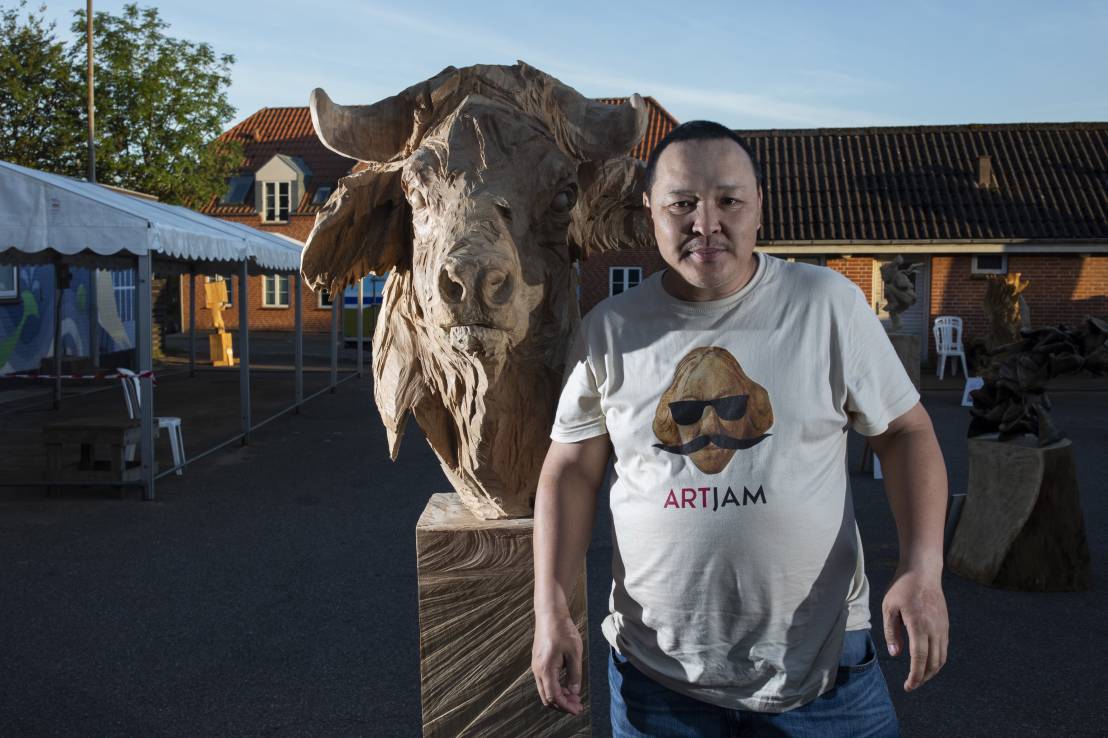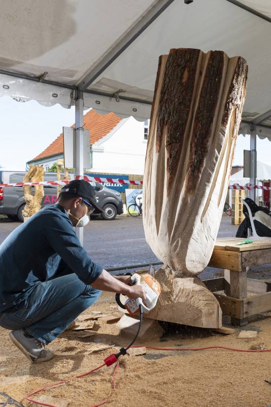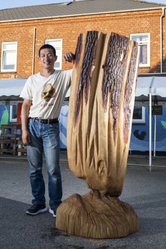 Do you remember Naruo? He participated at the Højer Art Jam for the first time back in 2004. In 2019 he came back again to participate at both Art Jam in Kolding and Højer, and he’s easily describable! Let’s call him a crock-wearing multi-talent. He’s spreading humor and joy around him with his always fun comments and good mood, he is playing the special Japanese guitar like a trained musician and he is swinging the chainsaw like a professional superstar. Oh, yeah… and he is wearing crocks – even on the dance floor! Did we mention that he is a REALLY good dancer?! His work requires a high level of precision, accuracy and mathematical skills, as he completely chopped up his trunk in small pieces before reconnecting them into a finished artwork puzzle. Thank you, Naruo, for your breathtaking result – and for being a joy spreader at the Art Jam.