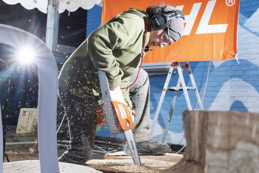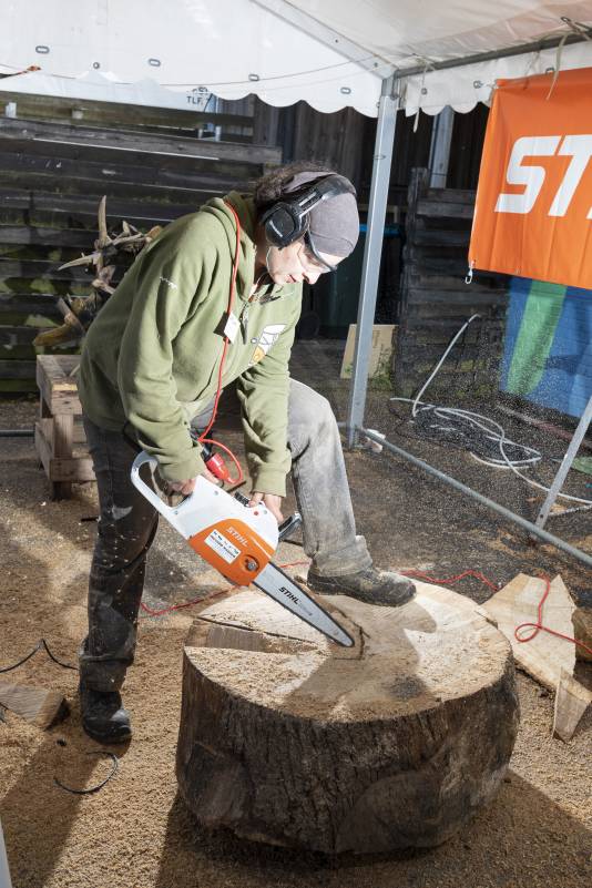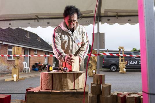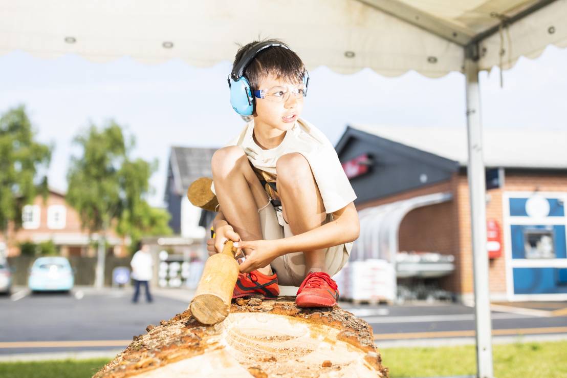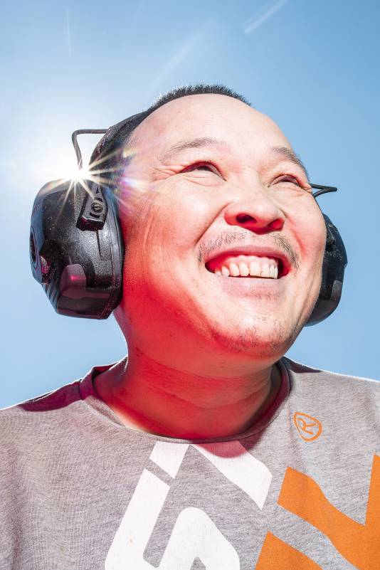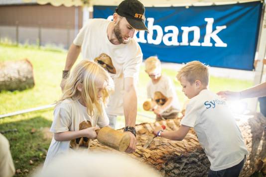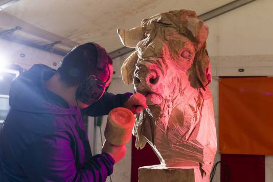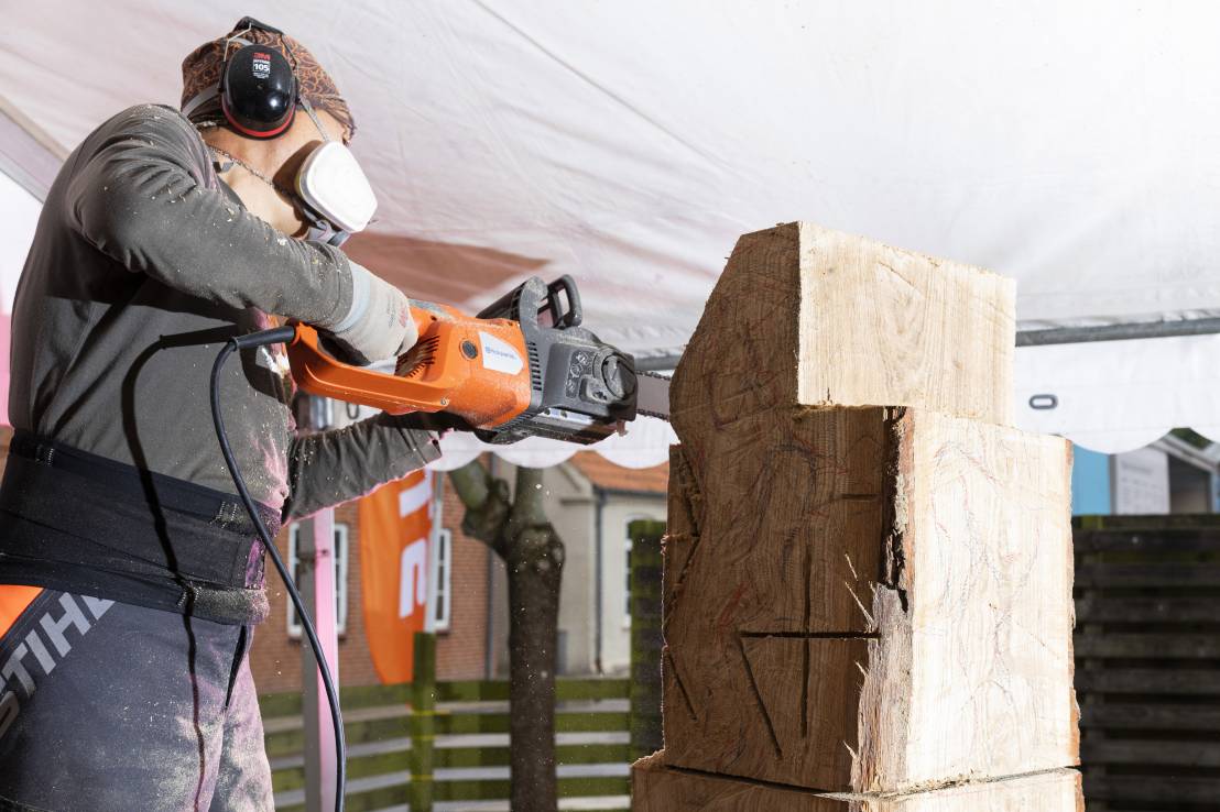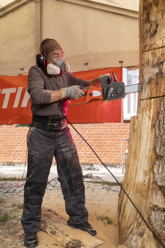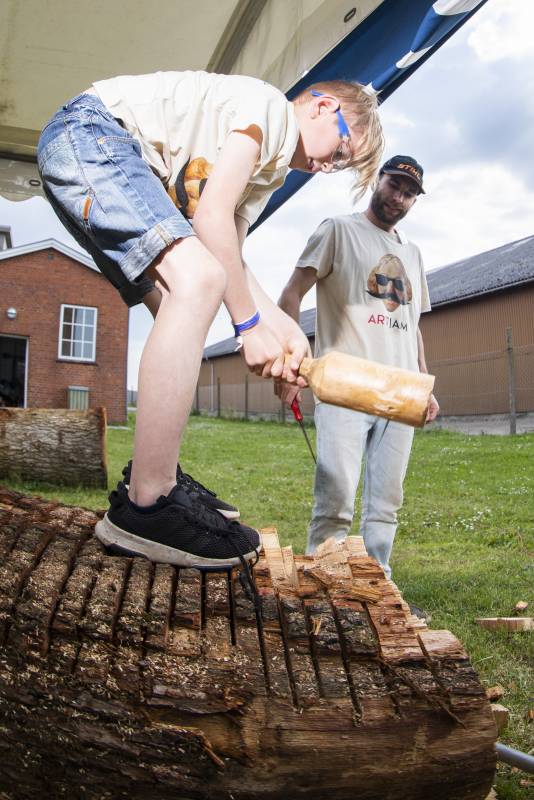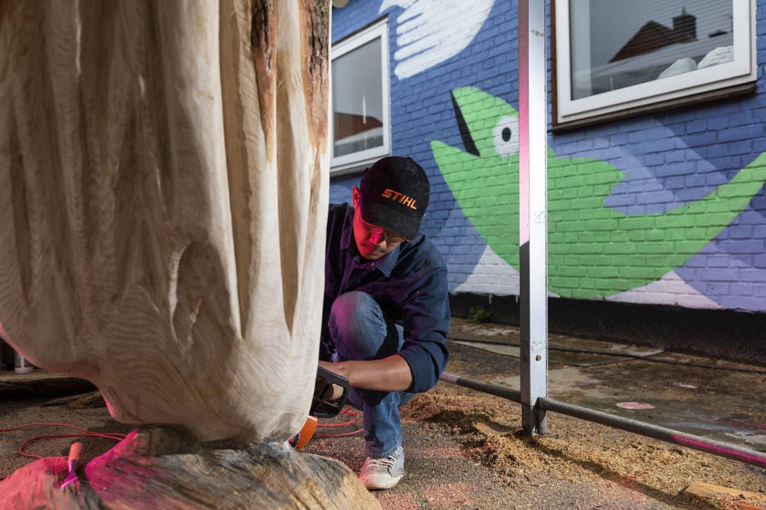 Do you remember Naruo? He participated at the Højer Art Jam for the first time back in 2004. In 2019 he came back again to participate at both Art Jam in Kolding and Højer, and he’s easily describable! Let’s call him a crock-wearing multi-talent. He’s spreading humor and joy around him with his always fun comments and good mood, he is playing the special Japanese guitar like a trained musician and he is swinging the chainsaw like a professional superstar. Oh, yeah… and he is wearing crocks – even on the dance floor! Did we mention that he is a REALLY good dancer?! His work requires a high level of precision, accuracy and mathematical skills, as he completely chopped up his trunk in small pieces before reconnecting them into a finished artwork puzzle. Thank you, Naruo, for your breathtaking result – and for being a joy spreader at the Art Jam.
